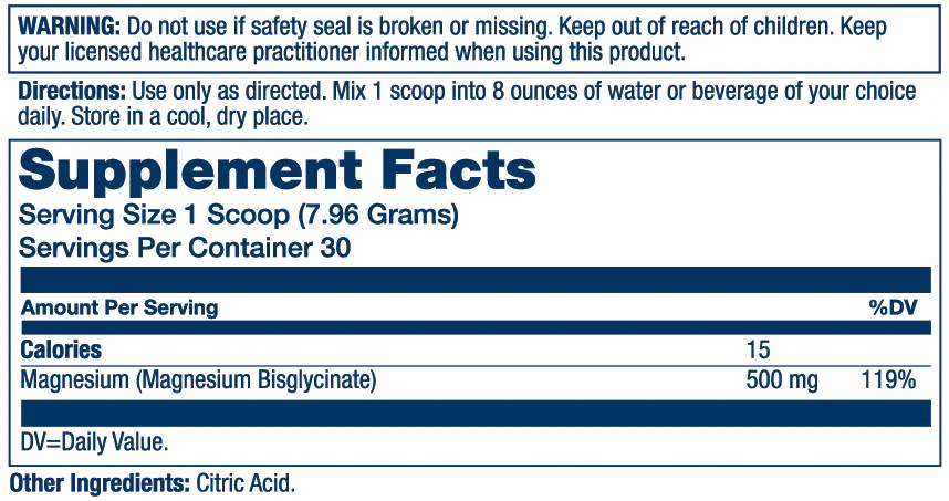 Quick Specs | Feature | Details | | Dosage | 500 mg per scoop | | Form | Chelated Magnesium Bisglycinate | | Flavor | Unflavored (Mixes into any beverage) | | Size | ~8.4 oz (50 servings) | | Dietary | Vegan, Non-GMO, Gluten-Free | Pro Tip: For the ultimate evening wind-down, mix one scoop into a glass of tart cherry juice or herbal tea about 30-60 minutes before you plan to hit the hay. |