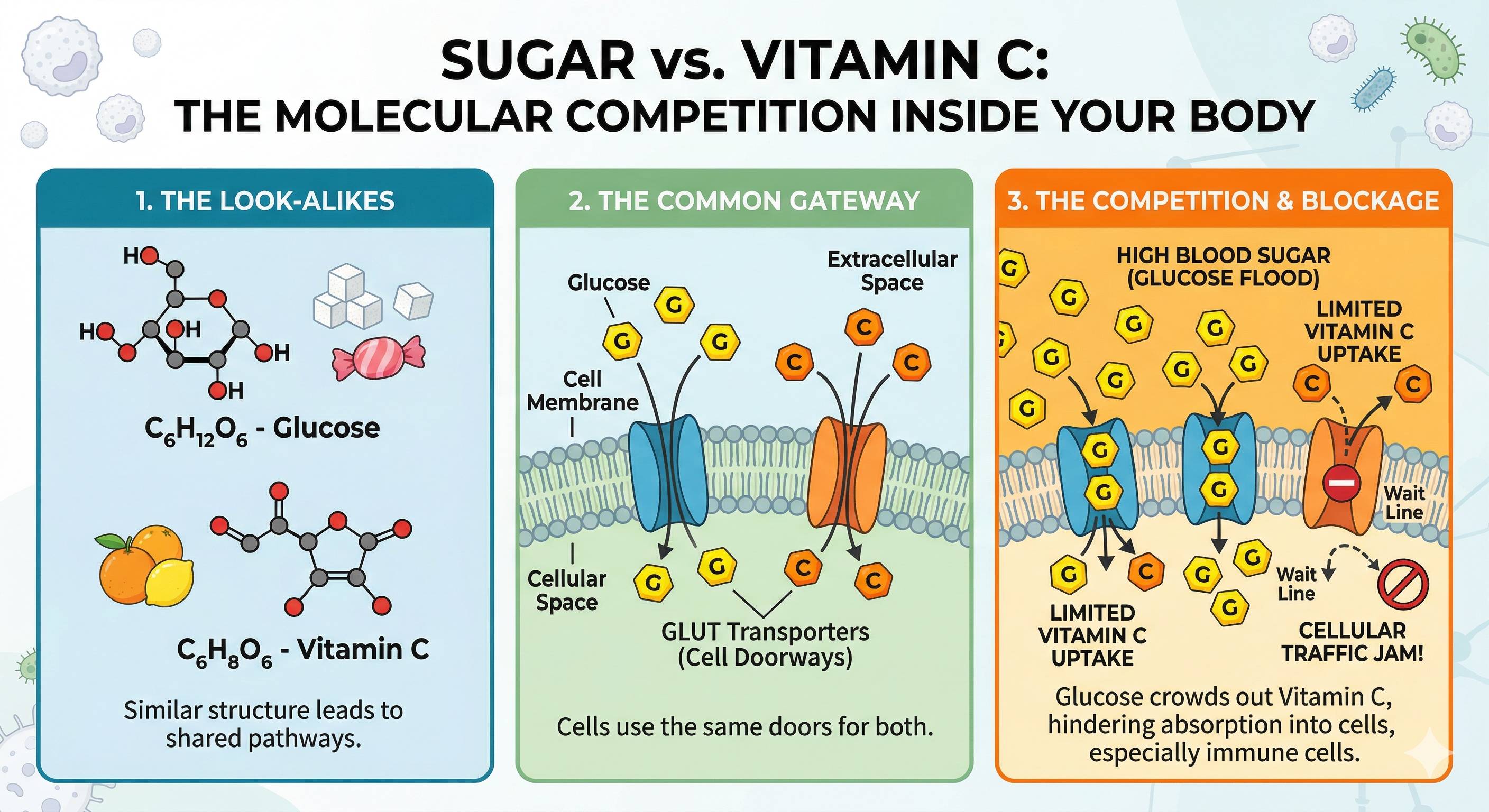 The GLUT Transporter CompetitionThe main "doorways" used by both molecules are called Glucose Transporters (GLUT), specifically GLUT1 and GLUT3.When you consume a high amount of SUGAR, your blood glucose levels rise. This floods the area surrounding your cells with glucose molecules. Because the GLUT transporters have an affinity for both glucose and Vitamin C, they will prioritize the molecule that is more abundant. The "Crowded Room" Analogy: Imagine a small door (the transporter) leading into a room (the cell). If there are 100 people wearing blue shirts (glucose) and only 2 people wearing orange shirts (Vitamin C) trying to get in at the same time, the blue shirts are statistically much more likely to make it through the door first. Why This Matters for Your HealthThis competition is particularly significant for the immune system. White blood cells require significantly higher concentrations of Vitamin C than the surrounding plasma to function effectively and fight off pathogens.