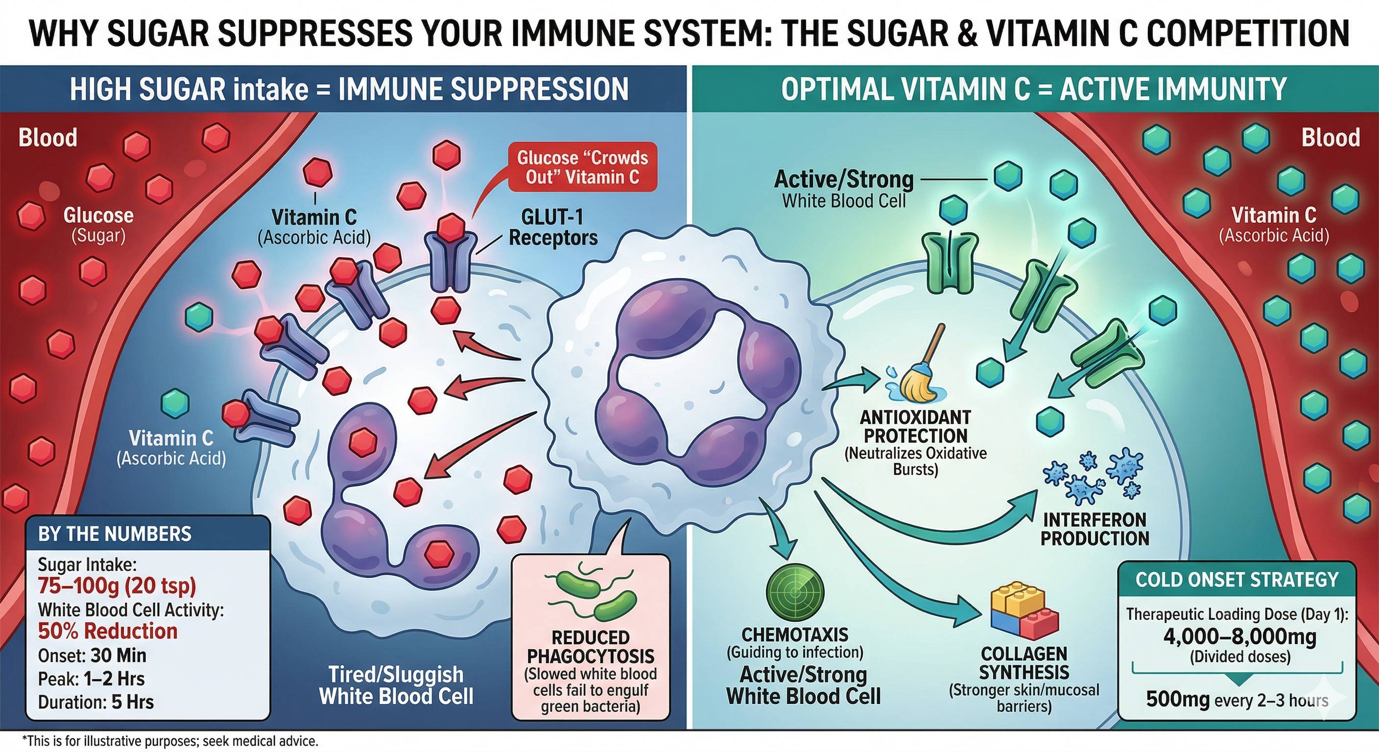 Sugar intake directly hinders immune function by slowing down phagocytosis, the process where white blood cells destroy pathogens, with just 75 to 100 grams of sugar reducing this activity by up to 50% for approximately five hours. This occurs because glucose and Vitamin C share a nearly identical molecular structure and compete for the same GLUT-1 receptors to enter cells; when blood sugar is high, glucose "crowds out" Vitamin C, preventing immune cells from utilizing the nutrient for essential tasks like antioxidant protection and interferon production. To effectively bolster the immune response at the onset of a cold, it is recommended to take a therapeutic loading dose of Vitamin C - roughly 4,000 to 8,000 mg in divided 500 mg increments throughout the first day - while strictly limiting sugar intake to ensure the Vitamin C can successfully navigate these cellular doorways.